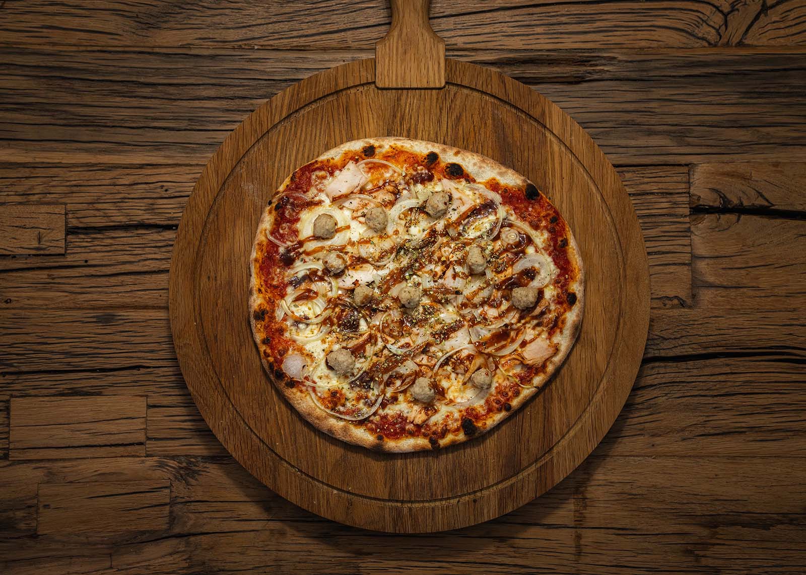 Tomatensaus, mozzarella, gehaktballetjes, witte ajuin, BBQ-saus