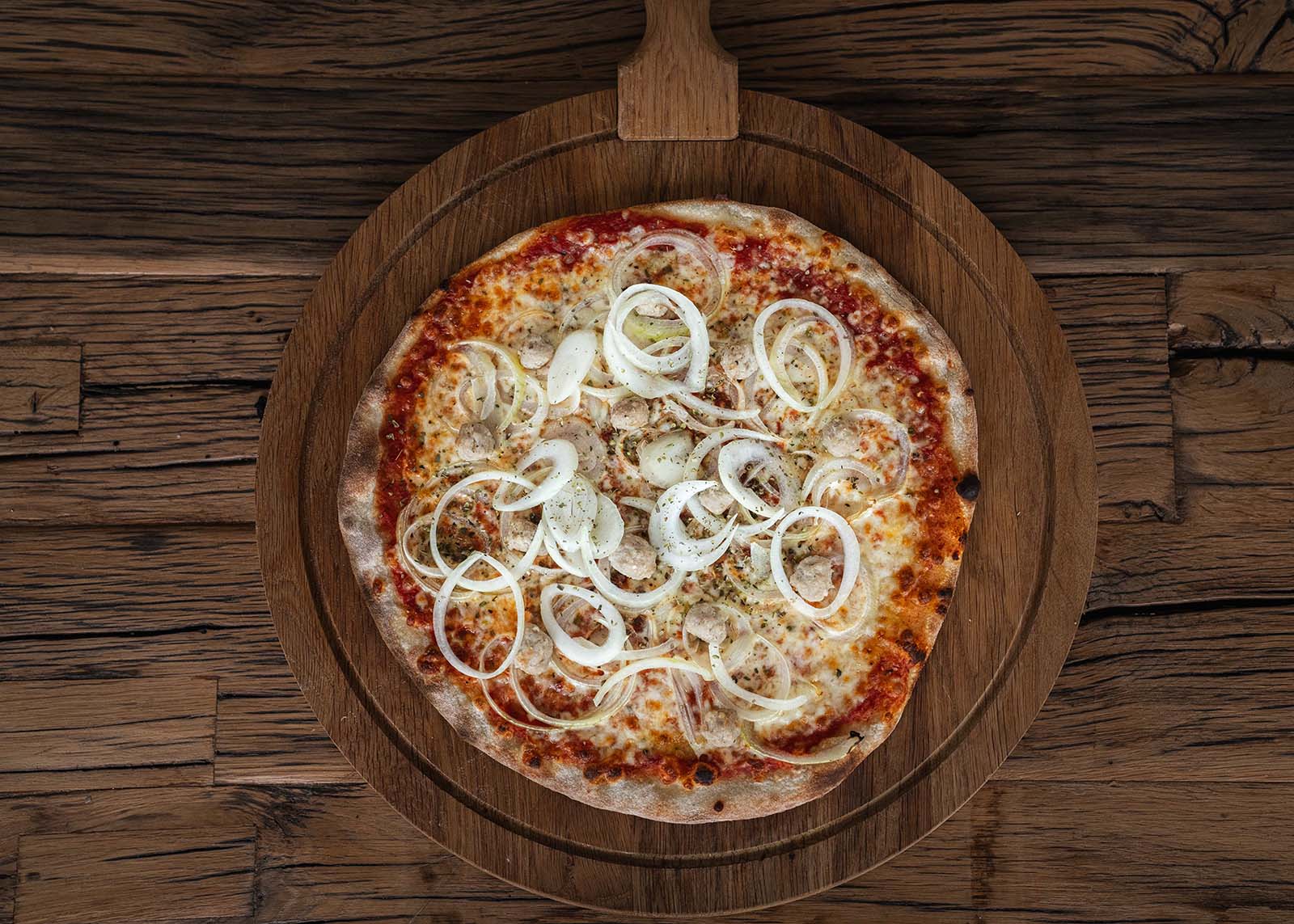 tomatensaus, mozzarella,tonijn, ansjovis, kappers, olijven, witte ajuin, oregano