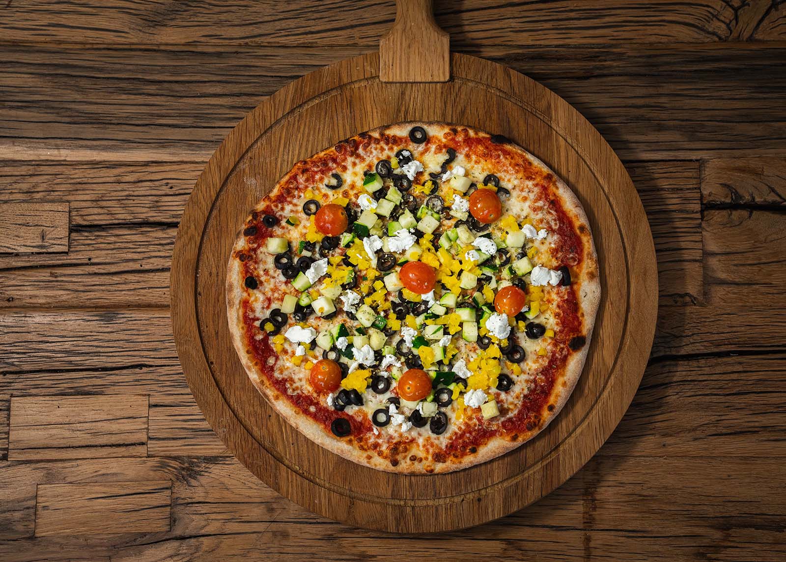 Mozzarella, tomtensaus, courgette, paprika, kerstomaten, olijven, geitenkaas,oregano