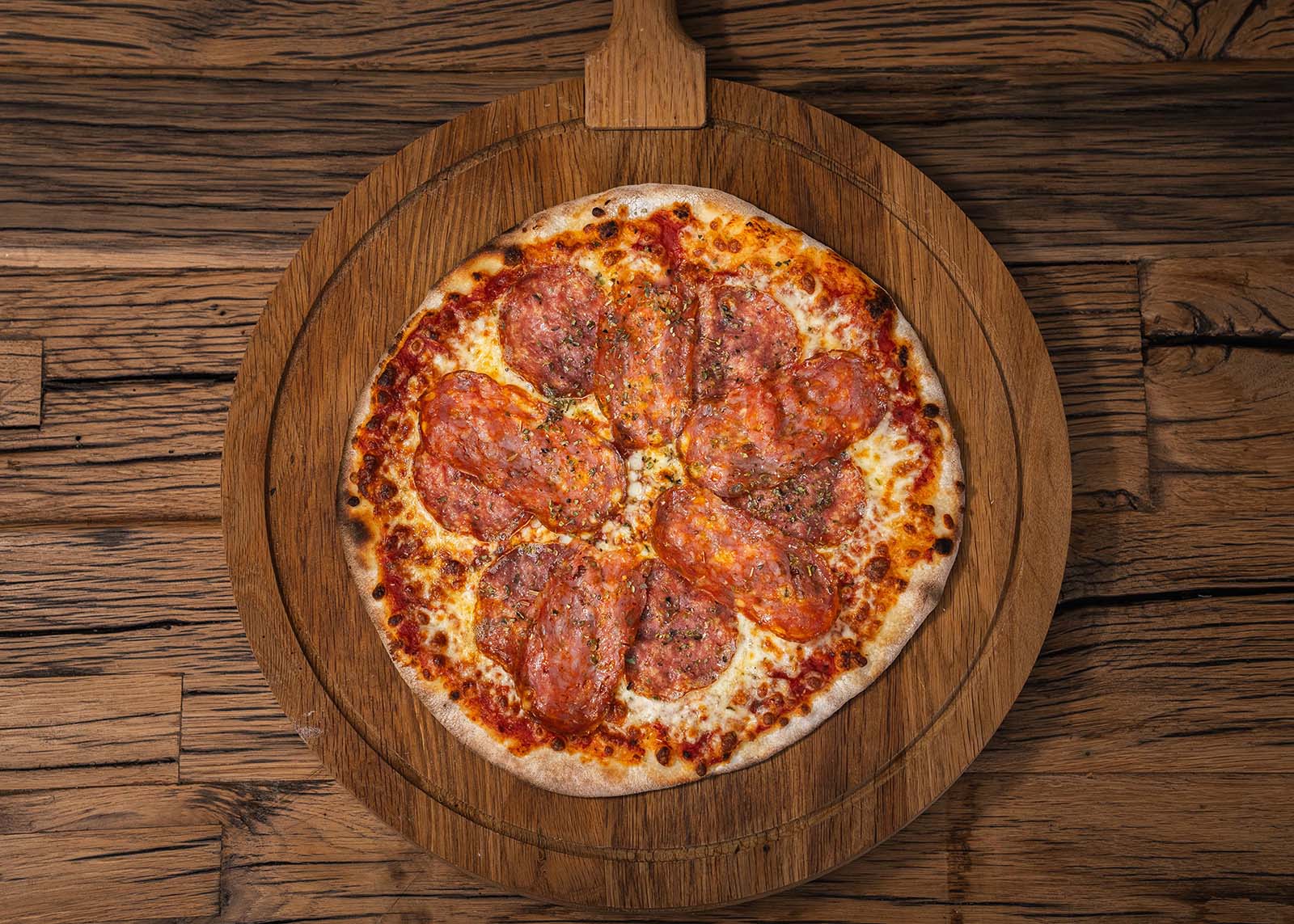 tomatensaus, mozzarella, pikante salami, jalapeno, oregano