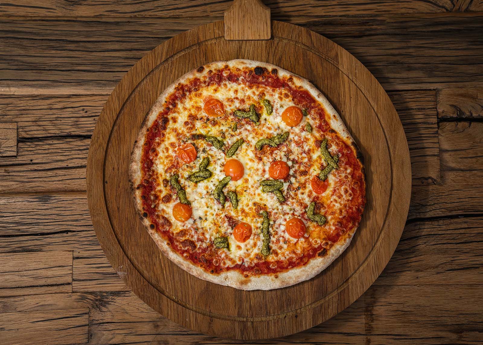 Tomatensaus, mozzarella, hesp, pesto, kerstomaatjes