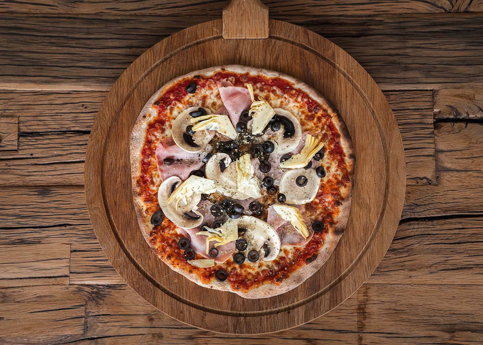 Mozzarella, tomatensaus, hesp, artisjok, champignons, zwarte olijven