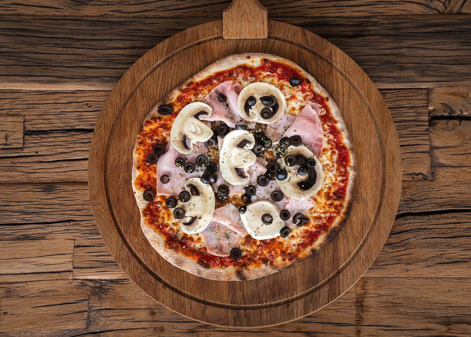 tomatensaus, mozzarella, hesp, champignons,zwarte olijven, oregano